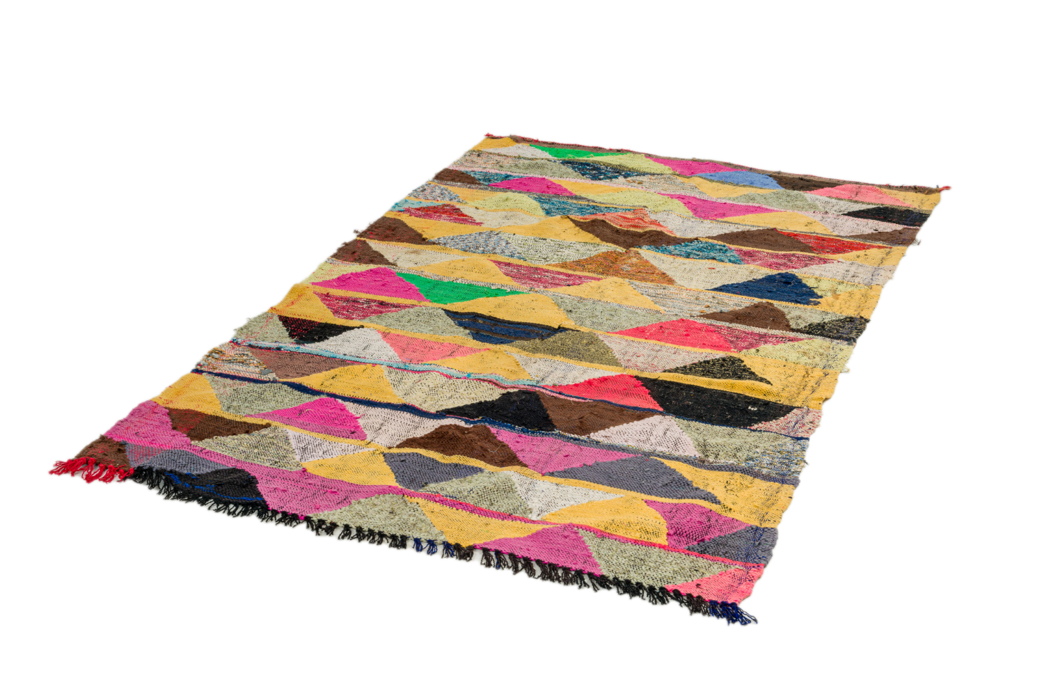 The Boucherouite is yet another of the fantastic rug creations from Morocco. The Boucherouite rug is a rag-rug made from previously used textiles, such as wool, cotton, yarn, synthetic fibres and other textiles that can be reused. This wonderful Moroccan rag-rug is one consequence of the change that has taken place over recent decades in the Moroccan countryside, where the ancient nomadic culture has been replaced by agriculture and other modern occupations in the countryside. Has a result, the exclusive wool from the sheep, which is the material in the Beni Ourain and Azilal rugs, has become even more rare. For this reason, it has become even more important to use textiles that have been used before, and the women in the Moroccan countryside do this magnificently. The colours and the pattern in the Boucherouite rug can be recognised from the Azilal rug and exactly as for the aforementioned, Boucherouite rugs also hang in various art exhibitions around the world.