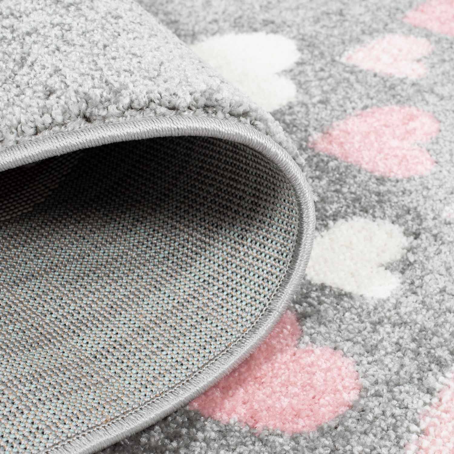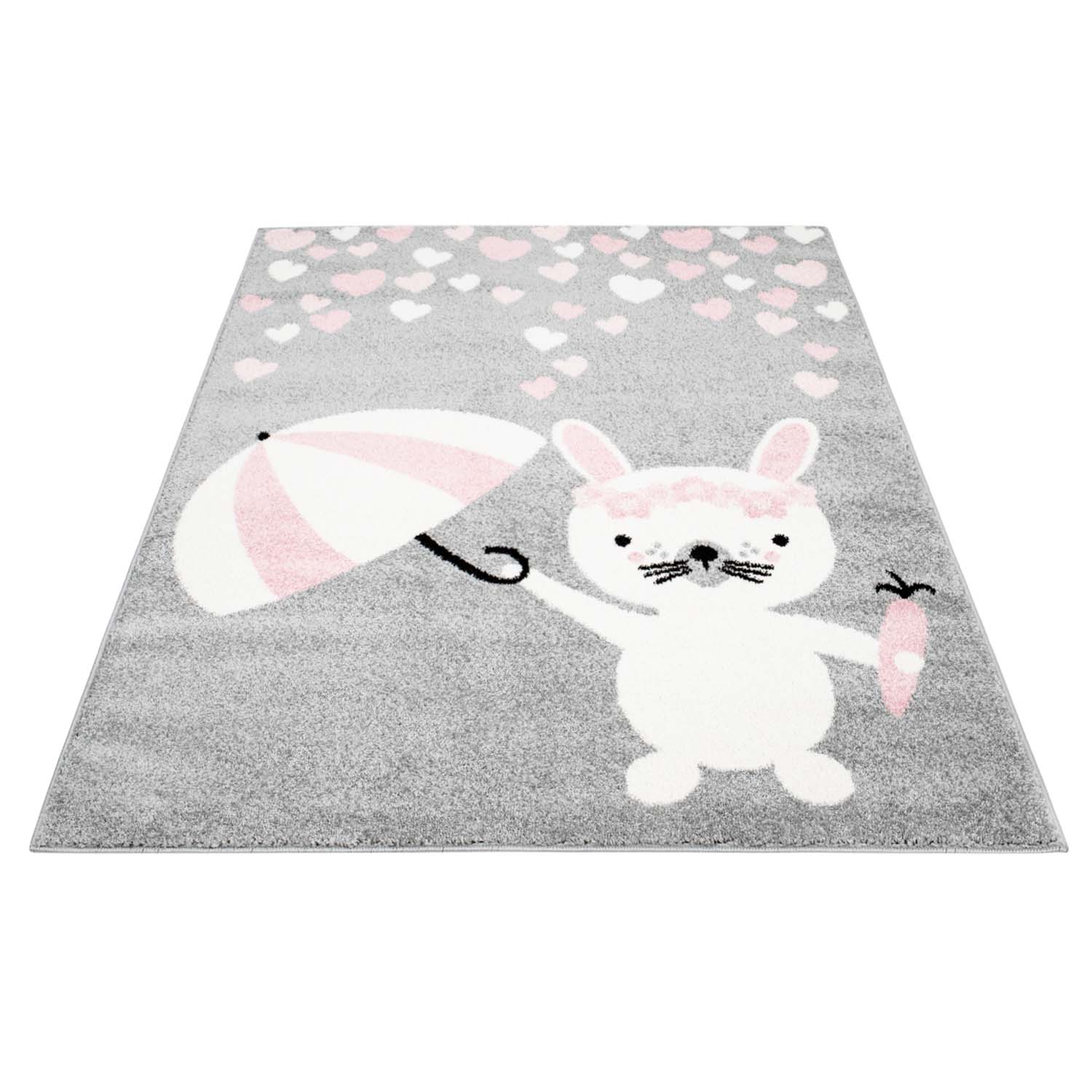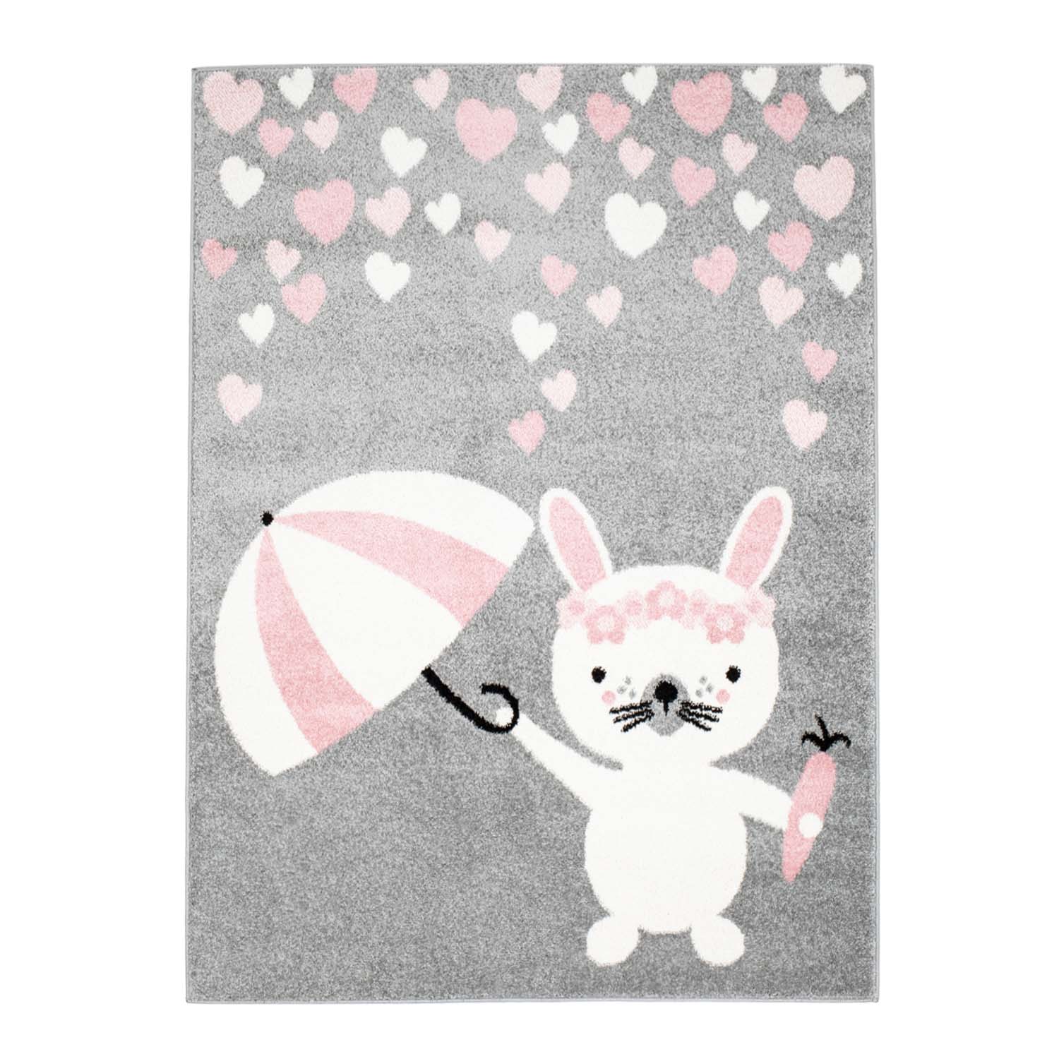 Children’s rug Bubble Rain - one of our best selling children’s rugs! A playful and fun rug that depict a rabbit with an umbrella under a rain of hearts. Trendcarpets children’s rugs are made of synthetic wool, are easily cleaned and repel dust and fuzz. The rug is grey with elements of white and pink.